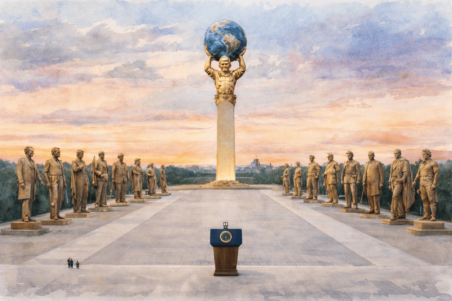 At the monument's apex, rising into the heavens themselves, stands a forty-five foot figure of President Donald J. Trump—cast in solid gold—holding the world in his hands. Not as a symbol of conquest, but as a declaration of peace. This is the Peace President. The man who achieved what every expert said was impossible. The man who ended wars without starting new ones.